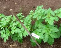 ベニカミキリは古い竹に付くとありましたが、このまわりには竹はないので、見渡したら古い篠棒がありました。ジャガイモを植えたところを種類がわかるように書いて挿しておいたものです。