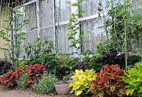 途中からボイスンベリーの大きな鉢をネットに近づけて空いている上のほうのネットに這わせてやりました。コリウス達は育ちがよくて大株になっています。