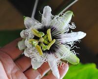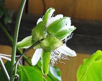 このパッションフルーツ(クダモノトケイソウ) より花を見るトケイソウのほうがそれらしく見えます。
