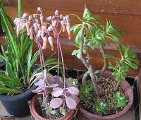 ※カランコエ・ラクシフロラらしいです。その左の細長い葉はフリージアです。