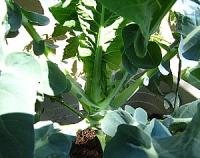 ここでは下のほうの込み入った外葉を花蕾(からい)に載せて日陰をつくりました。