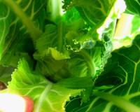 外葉を内側に折り込んで白い部分(頂花蕾)を覆っておきます。これはカリフラワーの花蕾(からい)に直射日光が当たると黄化してしまうことがあるからです。