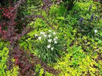 グランドカバーになっているのはリシマキア・ヌンムラリアオーレアやアジュガです。