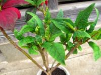 ポインセチアは日が短くなると花芽ができる短日植物です。9月にポインセチアの短日処理を2†3日間はしたのですが、ダンボールを外さなかったり、覆うのを忘れたりと続いたので、今回はあきらめて自然に任せることにしました。でも夜間照明のある所に置くと色づきが始まりませんよ。