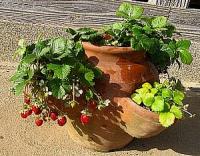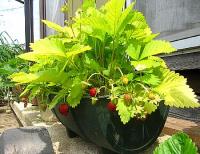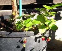ストロベリーポットには4種類のワイルドストロベリーと一番上の段には大粒の四季なりイチゴが植えてあります。このストロベリーポットにはもう何年も色々なイチゴを育てています。