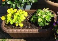 ライムグリーンのワイルドストロベリー(左)と斑入りのワイルドストロベリー(右)を寄せ植えにしました。