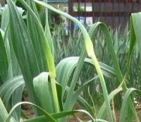 この頃になると茎が伸び、いわゆるとうが出てきます。これが「茎にんにく」です。