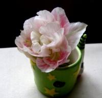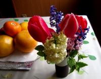 フラワーアレンジメントではありませんが、ケーキのカップに八重咲きのチューリップを入れただけ。これだけでも食卓がホットな雰囲気に・・・