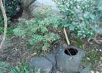 筑波石のつくばいの脇に植えられているアセビ(義弟の自作の庭にて)