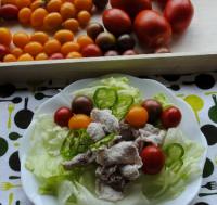 この日の収穫。我が家で栽培した野菜と豚シャブのサラダ・・・ かなり幸せな気分になります。