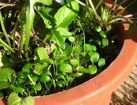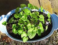 ビオラとクローバーの寄せ植えや中央に四季なりワイルドストローベリーの斑入り、右側にちょっぴり赤くみえるのがキンギョソウです。