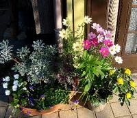 左側の黄色のコスモスの寄せ植えにはパンジー・ビオラが植えてあります