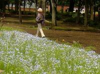 ネモフェラの花壇の向こうを友人がさっそうと歩いています。