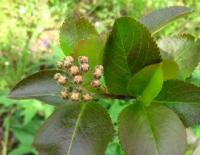 「アロニア・アルブティフォリア」は新しい枝・葉裏・萼筒・萼片に毛があり、果実の色は赤ですから黒紫色のこのアロニアは違いますね。