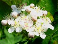 アロニア(チョコベリー)の花はナシの花のような白で、つぼみのうちはほのかなピンク色。