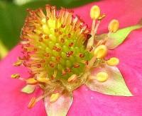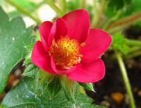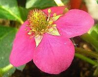 紅茜の開花。きれいな赤色の四季成りイチゴです。この花を見ただけでもう満足です。