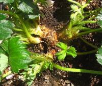 最近の四季成りイチゴはかなり木質化するのですね。我が家の四季成りイチゴ「おしんちゃん」はこれほど木質化しません。夏姫も木質化したところをコガネムシの幼虫にかじられてしまいました。下のようになってしまいましたが、こちらは復活しました。