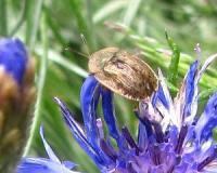 捕まえようとしたら、近くの矢車草()の花に逃げたカメノコハムシの成虫。