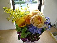 バラ、アジサイなどのフラワーアレンジ(つくば市内の歯科医院にて)