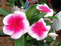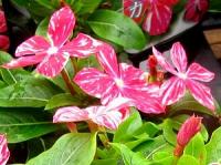 赤に白い斑入りのビンカ「アスカ」 (多湿に弱いので、梅雨時には軒下などに)