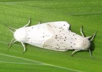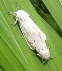 畑のグラジオラスの葉にいた交尾中のアメリカシロヒトリの成虫。