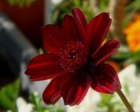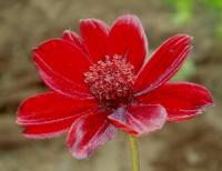 上のチョコレートコスモスの花と同じ花ですが、シックな濃赤の花の色に撮れています。