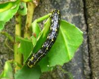 ある幼虫が我が家の塀に沿わせて植えてあるつる性のマサキに似た葉をかなり食べ尽くしていた。マサキと黒地に黄模様の虫で検索したらこの虫「ユウマダラエダシャク」にヒットした。多分、これで正解かと思いますが・・・