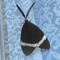 ホタルガの成虫は頭部が赤くなっていて、翅や体は黒くなっていて、白い帯があるのが特徴です。