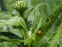 このハーベストムーンのつぼみを撮ろうとしたら、羽化したばかりのナナホシテントウが羽を乾かしていました。