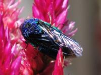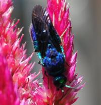 「青いハチ」で調べたらすぐ名前がわかりました。今はネットで調べられるので大変便利な世の中になりましたね。青蜂(セイボウ)・・・文字通り青い蜂です。