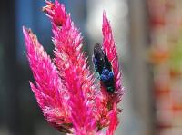 ケイトウの花にカメラを向けていたら、いきなりキラキラ輝く青いものがレンズを通して目に入ってきました。カメラを離して見ると初めて見る昆虫でした。