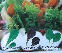 グリーンロメイン、レッドロメインはキク科で、ピノグリーンはアブラナ科の野菜です。