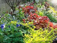 4日ほど過ぎたら、ミヤマオダマキの花も咲き、後方のハナニラの中から銅葉のリシマキア・ファイアークラッカーが伸び出しました。赤い葉のヒューケラはここには似合わないかしら?