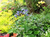 手前左からブルンネラ・ジャックフロスト、その右はメギ、黒と赤っぽい葉はヒューケラで中央左はミヤマオダマキ、その右はブルンネラ・マクロフィラで小花が咲いています。