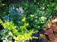 ミヤマオダマキのまわりはメギやヒューケラがあります。