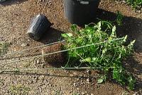 株元の様子です。ミニトマトは1本の茎を長く伸ばしましたが、マイクロトマトはこのように4本にしました。太い1本は途中から2本になっているので、全部で5本の枝になります。