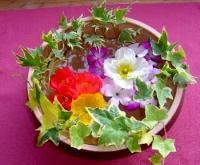 水盤に浮かべたアイスランドポピーです。アイビーやアグロステンマの花が入っています。