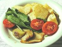 これはジャガイモとジャンボにんにくをオリーブオイルで炒め、トマトとほうれん草を添いました。