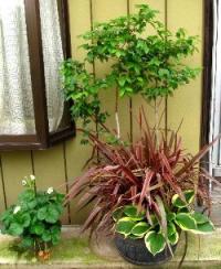 寄せ植えの全体の様子です。ブルーベリー、ピンクのニューサイラン、ホスタもこのときは元気でした。