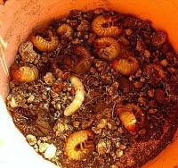 ブルーベリーの寄せ植えの土の中から大きなコガネムシの幼虫がでてきましたよ。
