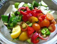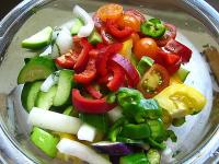 ここでの材料は赤いのはカラーピーマン(パブリカ)、オレンジはミニトマト、ピーマン(カプット)、