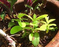 元の株は枯れてしまいましたが、さし木は無事に発根し、素直に育っています。元の株はどうして枯れてしまったのでしょう? 奥のさし芽はキンジソウです。