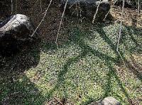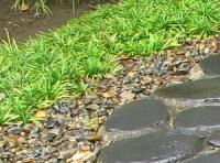 玄関へのアプローチにある敷石(筑波石)の間に植えつけたタマリュウ(玉竜)。