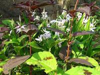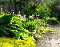 ここにはツワブキやギボウシ(ホスタ)、ヒューケラ(ツボサンゴ)、ブルンネラ類、ホウチャクソウやキバナホウチャクソウもあります。