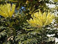 ヒイラギナンテンに比べると日向でも日陰でも成長する剛健品種で、芳香のある小さな黄色い花を穂状に咲かせています。