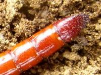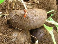 ジャガイモ「シャドウクイーン」を掘っていたら、赤褐色の長い虫が出てきました。
