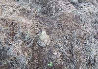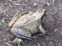 畑作業中に、土の中に潜って冬眠中のアカガエルを起こしてしまいました。