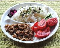 こちらは豚肩ロースを生姜醤油を絡めて炒めたものに、キュウリ、クッキングトマトを生のまま添えました。家で野菜を育てていると食べる直前に収穫するのでとてもおいしいですよ。