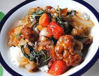 クッキングトマトや酢豚の素に入っている肉団子に切ったタマネギを炒めて、最後にや金時草を入れてからタレを絡(から)めました。