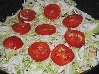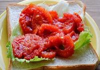 クッキングトマトを厚めにスライスして両面を焼きました。まずレタスの上これをに載せます。